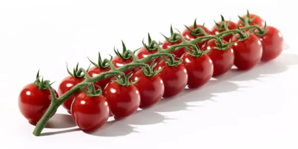 Dit mini tros-cherrytomaatje heeft een opvallend dieprode kleur.