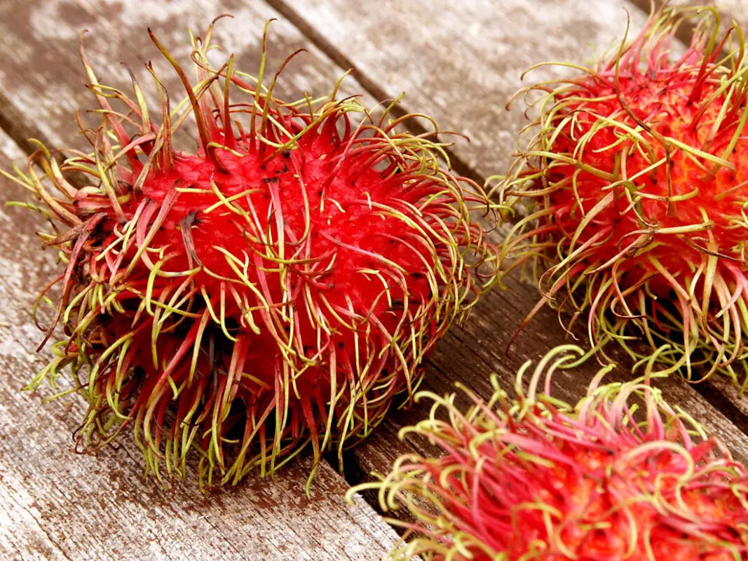 Rambutans (ramboetans) zijn ongeveer even groot als kastanjes. De naam van de vrucht komt van het Maleisische woord ‘rambut’ dat ‘haar’ betekent. De zachte, haarachtige stekels zijn bij verse rambutans rood of geel gekleurd.