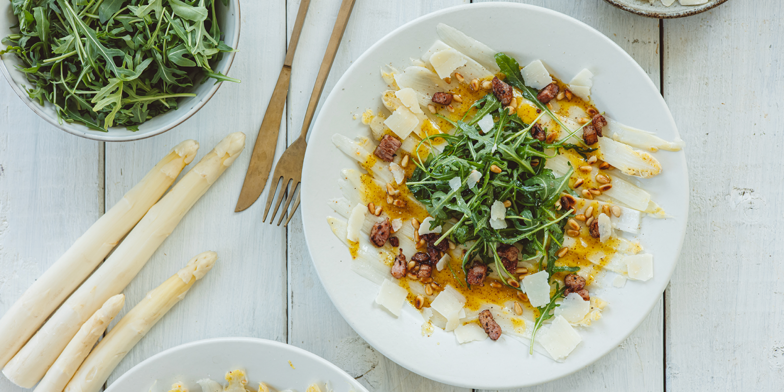 Rauw, fris en gezond! Serveer asperges in hun puurste vorm als voorgerecht. Dit recept is jouw nieuwe favo alternatief op de klassieke carpaccio.