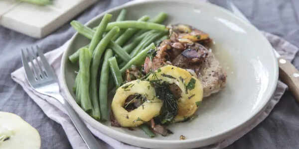 Gebakken appel past prima in een avondmaaltijd, zeker in combinatie met varkensvlees! De knapperige boontjes en ui en spekjes maken dit feestelijke gerecht helemaal af.