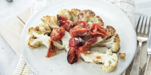 Bereid bloemkool eens anders! Geen roosjes, maar plakken. En die kun je dan weer beleggen met allerlei lekkers, zoals deze zoete, plakkerige tomaatjes.