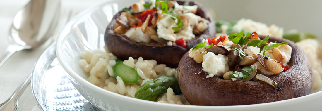Snijd de steeltjes uit de portabella’s, hak de steeltjes fijn en voeg ze samen met de tijm, geitenkaas en peper aan de kom met ui toe. Vul de portabella’s ermee, zet ze in een ovenschaal en verdeel de pijnboompitten erover. Bak de portabella’s ca. 20 minuten in de oven.