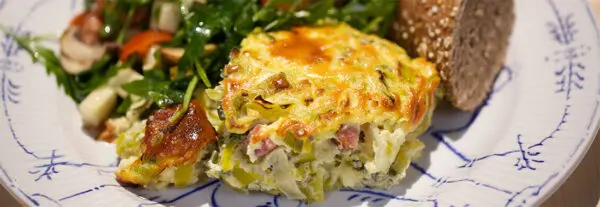 Meng met een staafmixer de eieren, kookroom, honing en de grove mosterd en breng op smaak met een beetje zout en versgemalen peper. Verdeel de ham en de prei over een met olie ingevette ovenschaal en schenk het eiermengsel erover.
