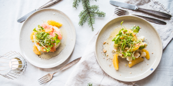 Tip: gebruik een ring of een bakje om een net bolletje van hetgeheel op het bordje te maken. Leg hier bovenop de gerookte heilbot, zalm of walnoten, drapeer de partjes sinaasappel, de waterkers, strooi er wat zwarte peper over en een klein beetje olijfolie.