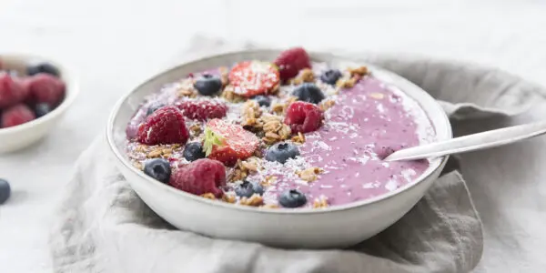 Smoothiebowl met blauwe bes, framboos en aardbei