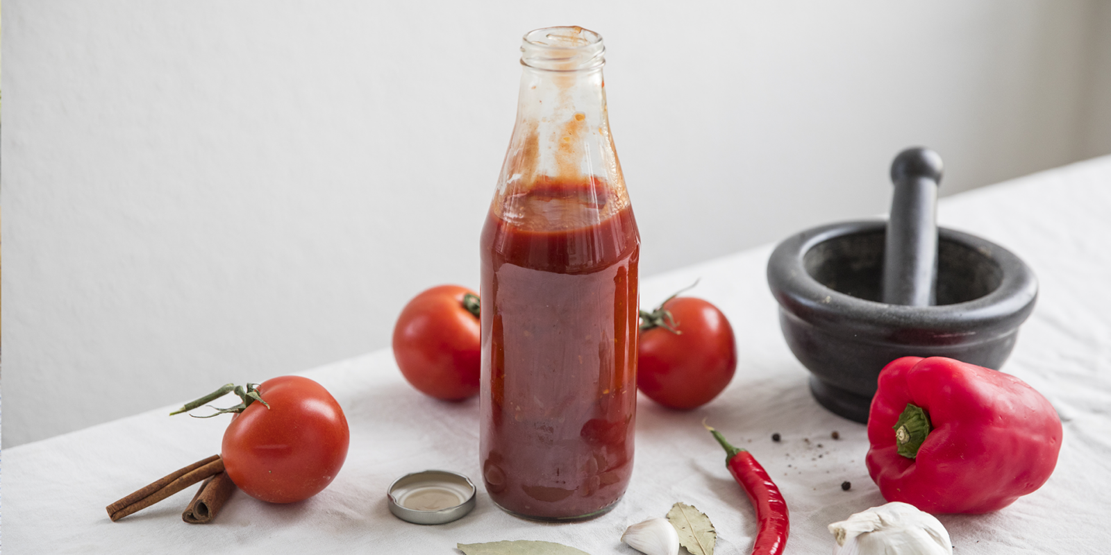 Neem een schone stoffen zakdoek, doe hier de in reepjes gesneden rode peper, het laurierblad, het gekneusde mosterdzaad, de peperkorrels, het pijpje kaneel en de selderij in. Bind de zakdoek vervolgens dicht met een touwtje zodat een soort ‘kruidenbuideltje’ ontstaat. Hang dit in het tomatenvocht, voeg het zout toe en laat het geheel op een matig vuur tot de helft inkoken.